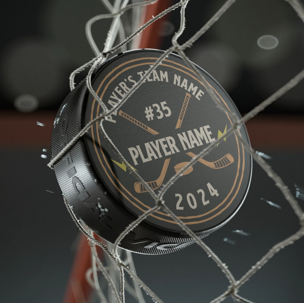 Capture the spirit and excitement of your favorite hockey moments with our Custom Hockey Player Puck. Each puck is a unique creation, designed to celebrate the individuality of your player and their standout performances on the ice.